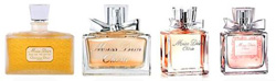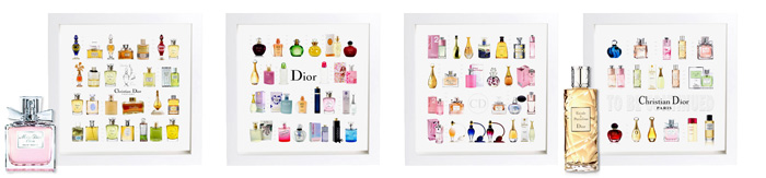 Plus récemment, j'ai mis au point, pour l'anniversaire d'une amie, elle aussi collectionneuse, une sorte  d'ANTHOLOGIE CHRONOLOGIQUE DES PARFUMS FÉMININS DE CHRISTIAN DIOR de 1947 à 2011   en 4 tableaux (format 25x25 cm)